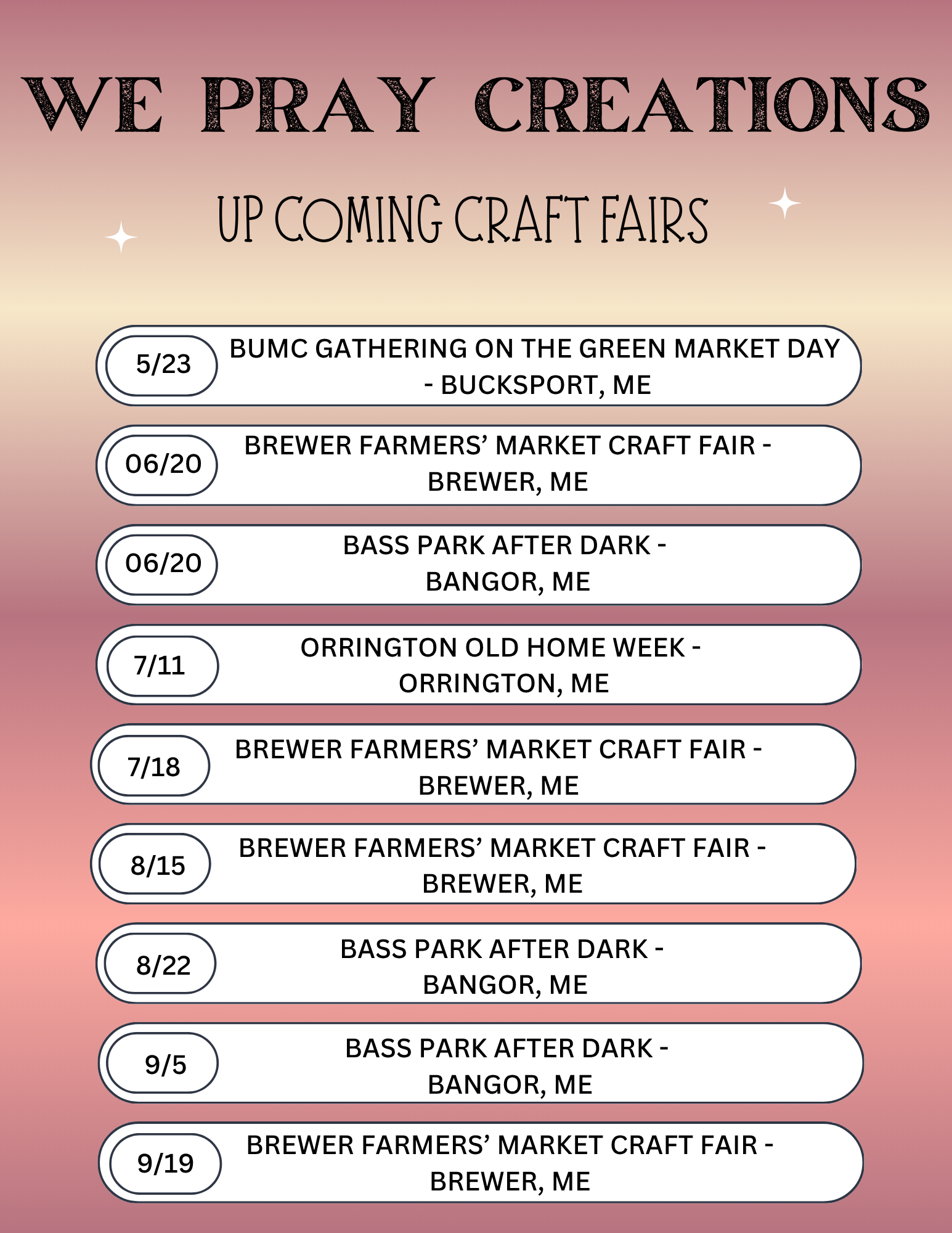 There’s nothing quite like seeing our handmade creations up close — and we’d love to meet you! Throughout the year, We Pray Creations sets up shop at craft fairs across Maine, bringing our custom engraved signs, coasters, bookmarks, cutting boards, and more to communities near and far.